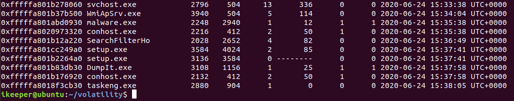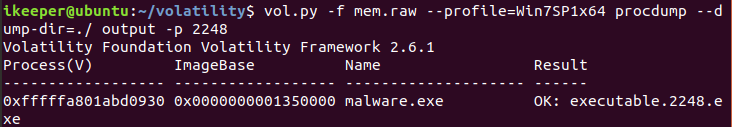 procdump 플러그인을 사용해서 'malware.exe' 프로세스를 실행 가능한 파일로 덤프했다.