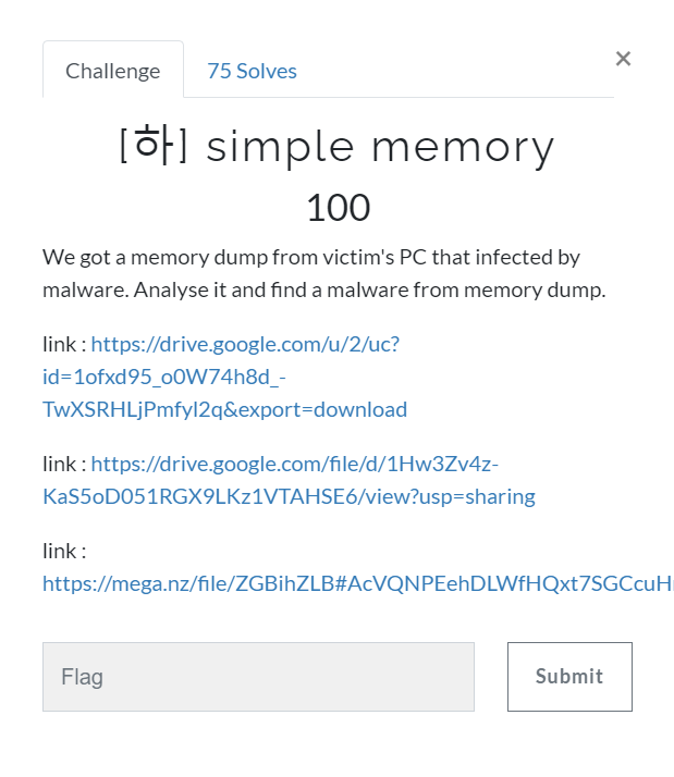 문제 첫 화면이고 메모리 덤프 파일에서 악성코드를 찾는 문제다.