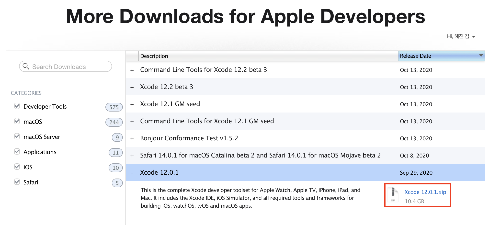그리고 원하는 Xcode 버전을 클릭하고 xip 파일을 선택해 다운로드 한다.